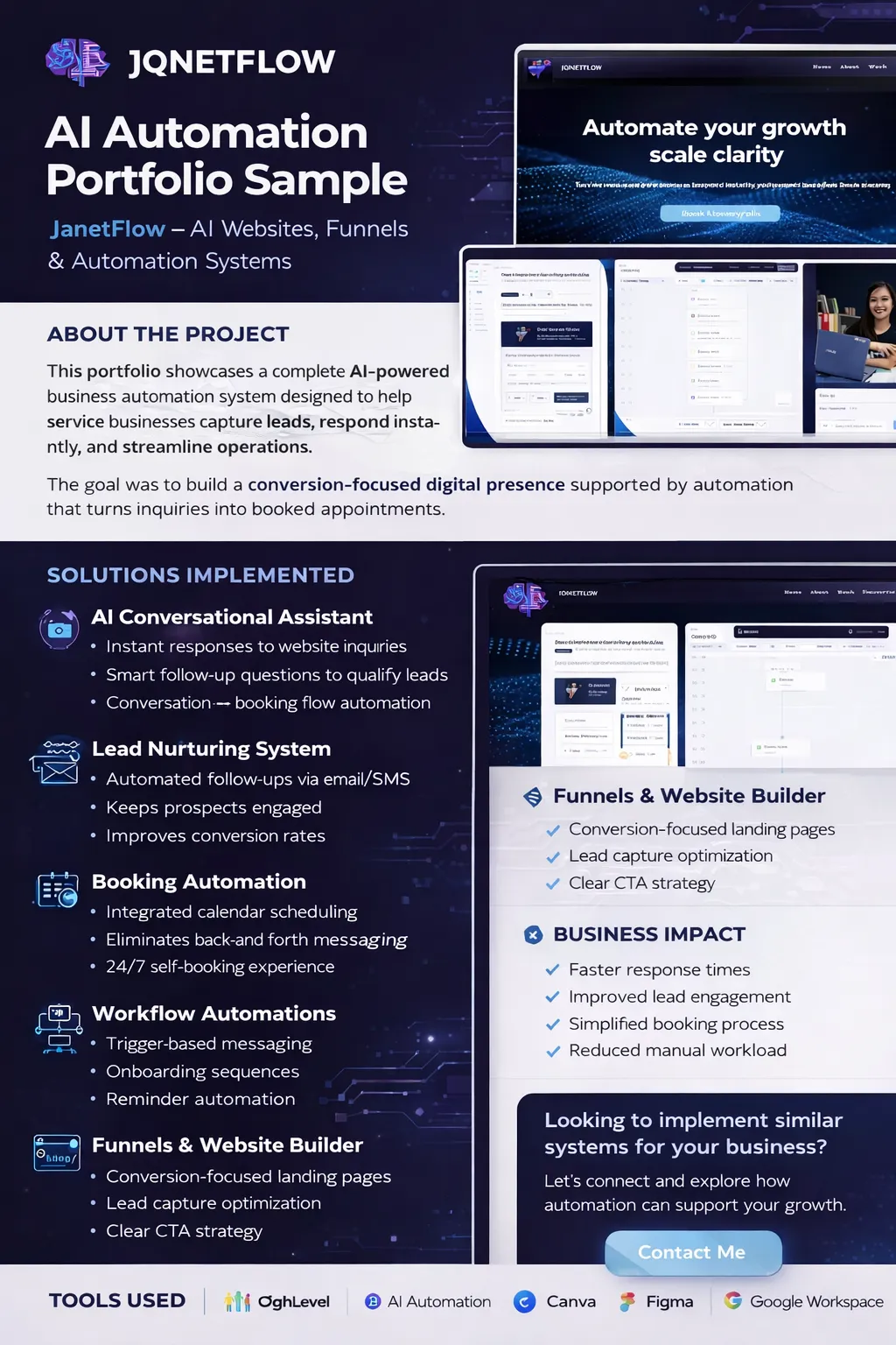 I help businesses grow using AI-powered websites, funnels, and automation systems that capture leads, streamline workflows, and turn conversations into conversions.